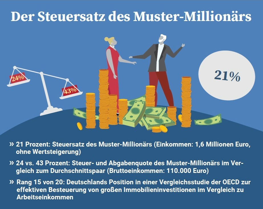 Ein hartnäckiger #Mythos: Deutschland ist ein #Hochsteuerland. Unsere neuen Berechnungen zeigen: Der deutsche Muster-Millionär hat nur eine halb so hohe Abgabenquote wie der Durchschnittsverdiener.