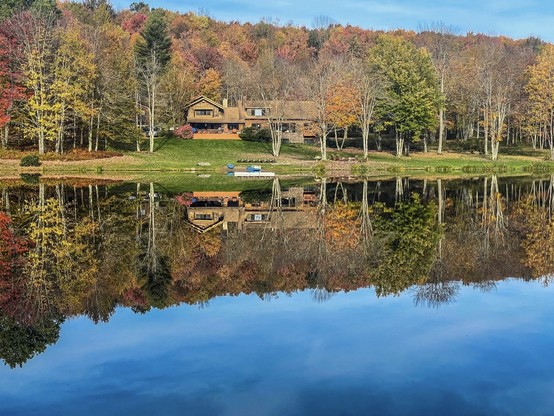 House on a lake on a quiet morning in upstate New York, near Bovin Center.