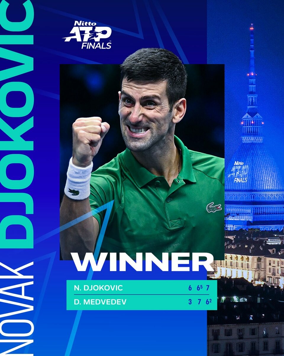 @DjokerNole@twitter.com defeats Daniil Medvedev 6-3 6-7 7-6 in 3 hours and 11 minutes at the #NittoATPFinals