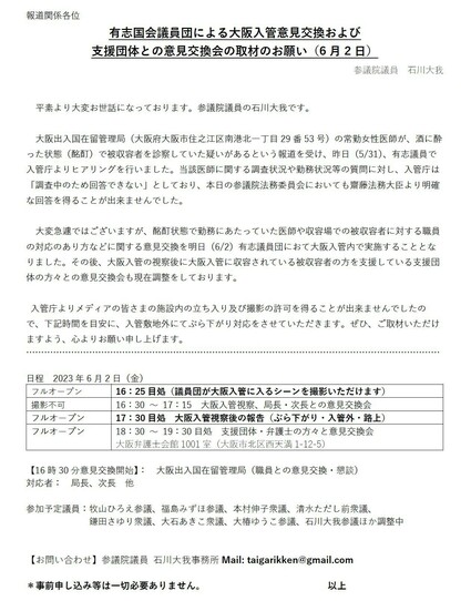 明日(6/2)、有志議員団で大阪入管を視察します。メディアの皆さんにも広く情報を共有させていただきたく、ご案内申し上げます。