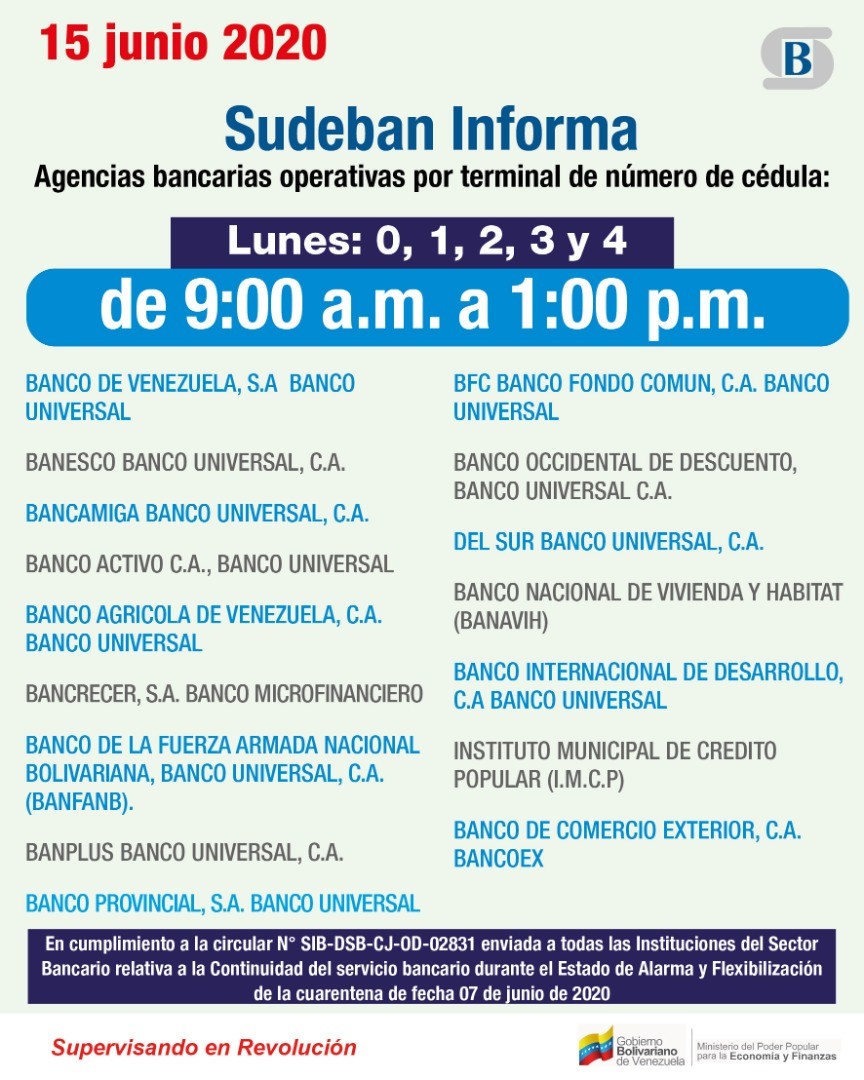 #DeInterés || La Sudeban informa que a partir de este 15 de junio las diferentes instituciones bancarias del país prestarán servicios a los usuarios de acuerdo al cronograma establecido en la circular SIB-DSB-CJ-OD-02831 de fecha 7 de junio de 2020.