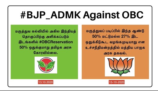 மருத்துவ கல்வியில் அகில இந்தியத் தொகுப்பிற்கு அளிக்கப்படும் இடங்களில் #OBCReservation 50% ஒதுக்குமாறு தமிழக அரசு கோரவில்லை. - மத்திய அரசு 13/10/2020