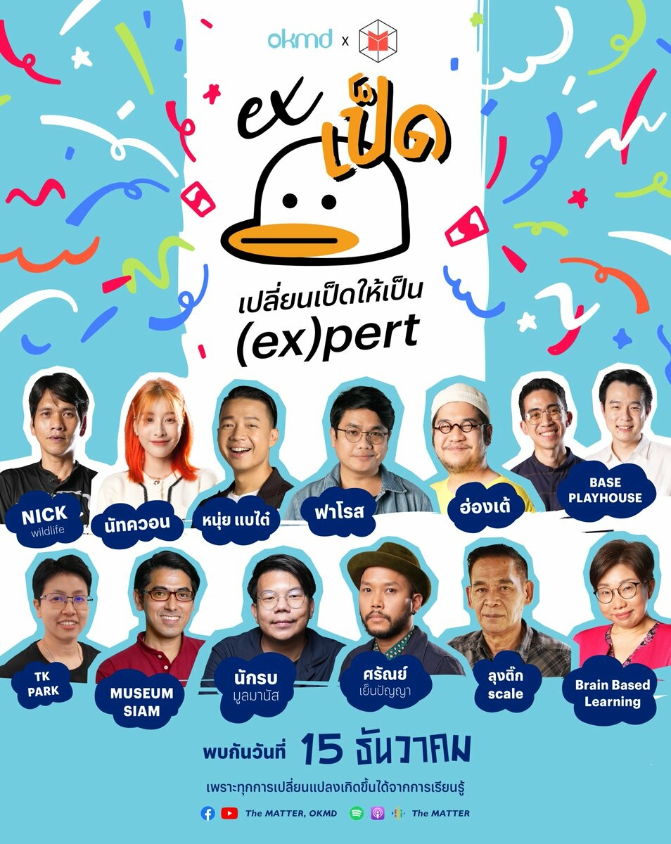 รายการ ‘#EXเป็ด เปลี่ยนเป็ดให้เป็น (ex)pert’ รายการใหม่จาก #TheMATTER และ #OKMD ที่จะนำเสนอเรื่องราวและประสบการณ์ของเหล่ารุ่นพี่เป็ดทั้งหลาย เพื่อทำให้เห็นว่าเป็ดแบบเราสามารถพัฒนาให้กลายเป็น EXPERT ในแบบของตัวเองได้ แล้วเจอกันก๊าบบบ 🦆