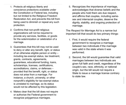 The #RespectForMarriageAct repeals the 1996 #DefenseOfMarriageAct and codifies federal recognition of states’ same-sex marriages if #Obergefell is overturned. But states could still refuse to allow any new same-sex marriages and former bans could apply.