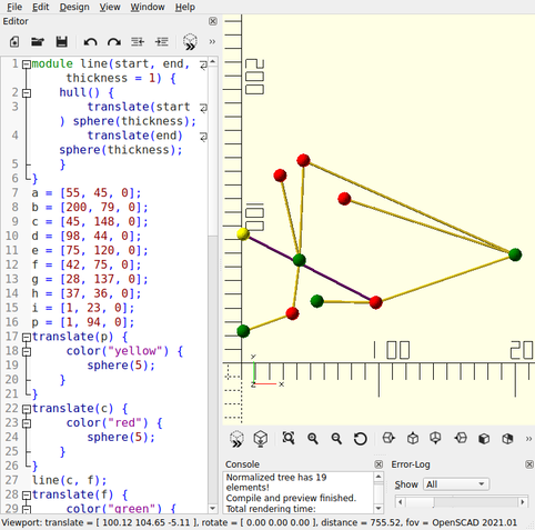 Since the my brain apparently doesn't like the nearest-Neighbors search to fully comprehend I started of by printing out scad code to properly debug how my tree is being built and what is the final result. (Spoiler, not working yet :P )