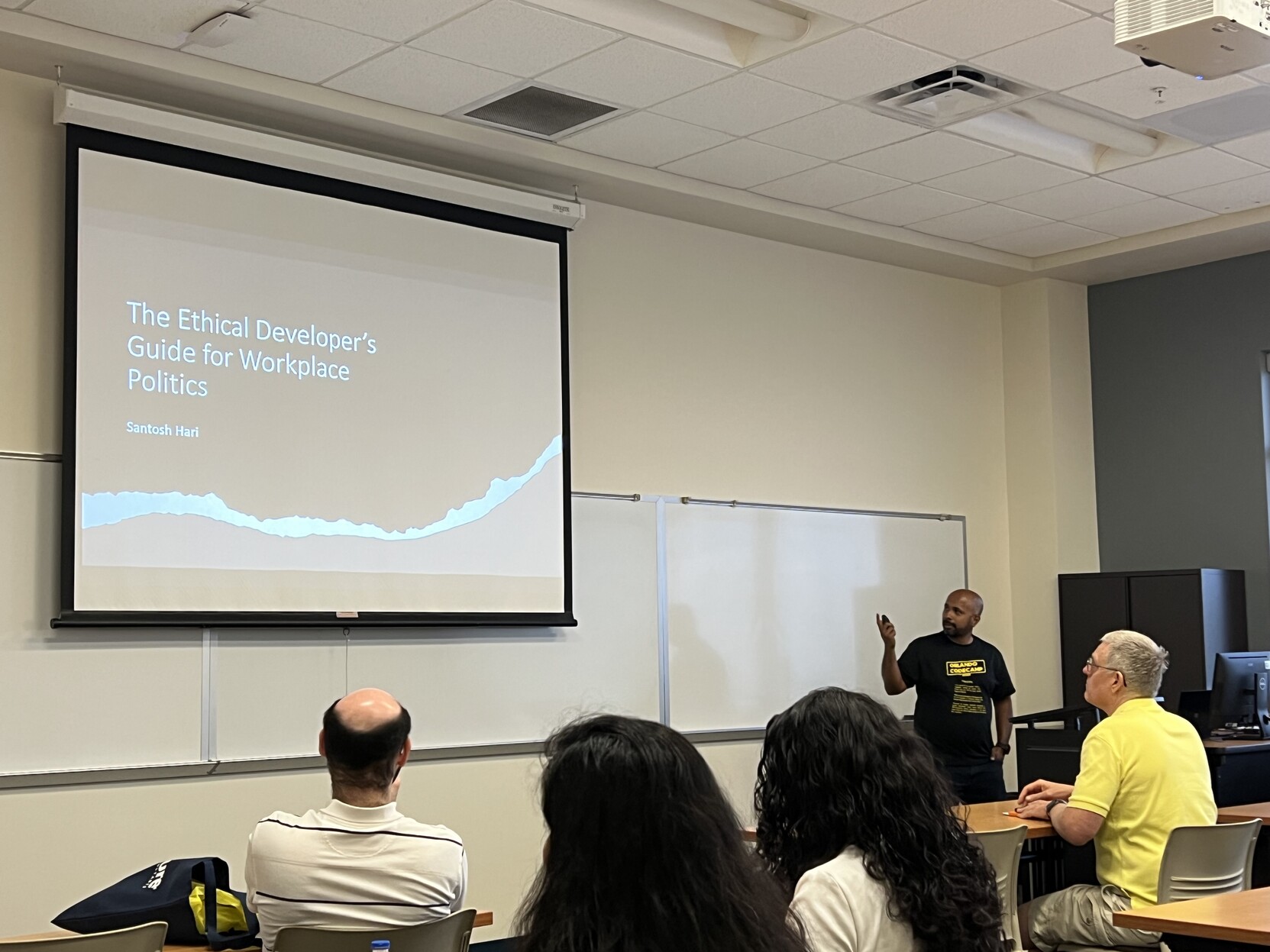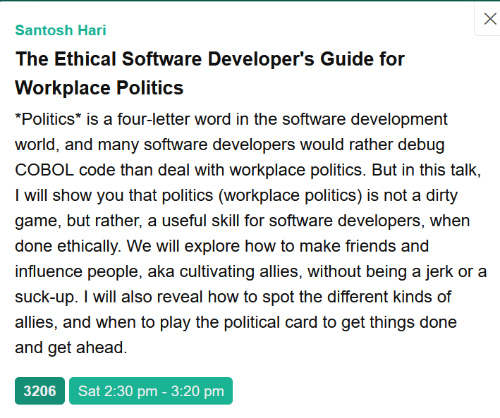 @santoshhari is now teaching us of the ethical use of politics in your organization #OrlandoCC - prime survival skill for more than developers