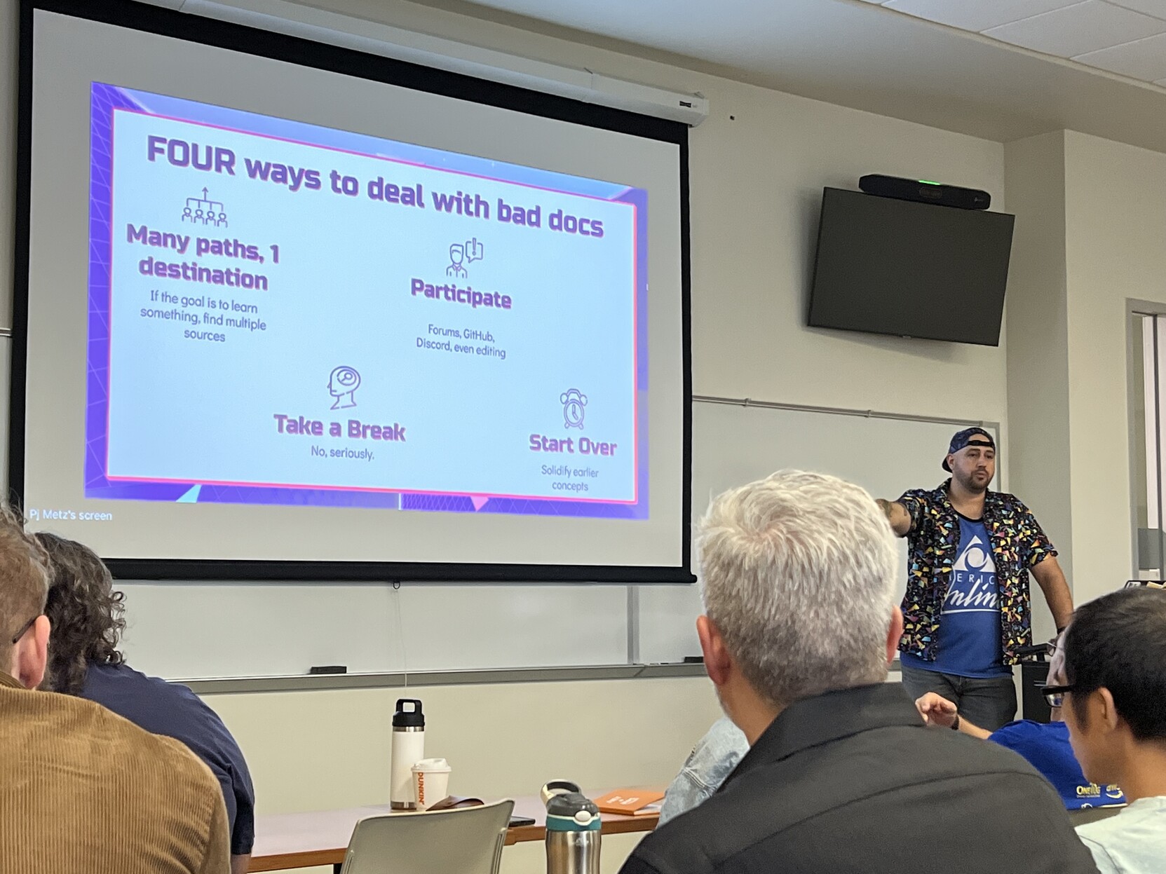 PJ Metz sharing great strategies on dealing with terrible software docs #OrlandoCC