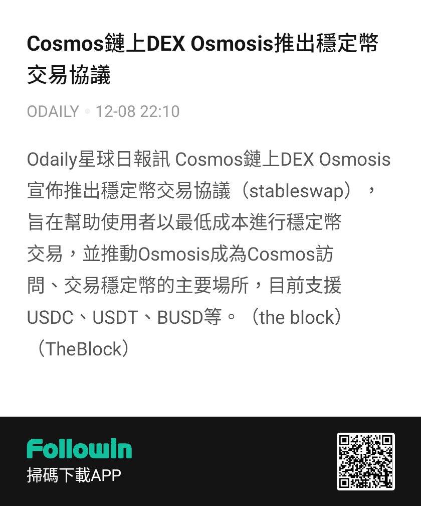 Cosmos鏈上DEX Osmosis推出穩定幣交易協議 https://followin.io/zh-Hant/feed/2162368?from=androidshare&su=4075595663