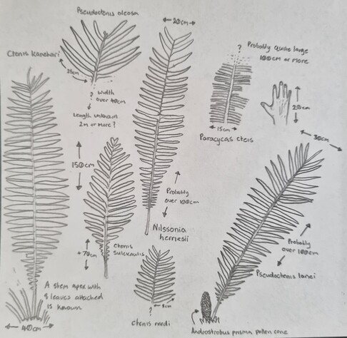Rough scale diagrams of some of the largest #cycad and Nilssonia leaves from the #Jurassic. #fossils #illustration #scientificillustration #Palaeobotany