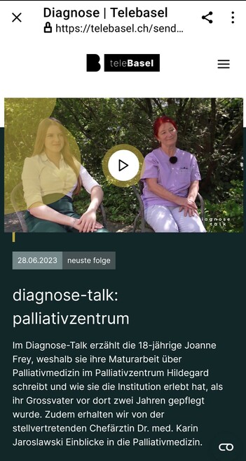 Im Diagnose-Talk erzählt die 18-jährige Joanne Frey, weshalb sie ihre Maturarbeit über Palliativmedizin im #Palliativzentrum #Hildegard schreibt und wie sie die Institution erlebt hat, als ihr Grossvater vor dort zwei Jahren gepflegt wurde. Zudem erhalten wir von der stellvertretenden Chefärztin Dr. med. Karin Jaroslawski Einblicke in die #Palliativmedizin