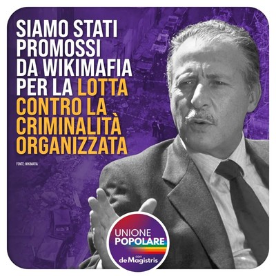 Con @demagistris@twitter.com e con i tanti candidati e candidate abbiamo aderito convintamente alla campagna di @WikiMafia@twitter.com #ParlateDiMafia. Per noi di #UnionePopolare la #Mafia resta uno dei principali problemi irrisolti in questo paese e non parlarne significa fare il loro gioco.