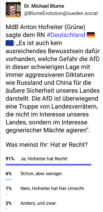 @Ustinoff Habe ja gerade eine #Mastodon-Umfrage mit 540 Befragten innerhalb nur eines Tages abgeschlossen: Über 90 Prozent (!) bejahen die Aussage von MdB #Hofreiter (Grüne), dass Teile der AfD „Landesverrat“ zugunsten von Russland 🇷🇺 und China 🇨🇳 betreiben. Staune selbst (als einstiger #Wehrdienst-Leistender) über den schnellen Abschied der meisten #Grünen vom militärkritischen #Pazifismus. Und finde diesen Lernprozess gut. #Demokratie muss leider immer wieder verteidigt werden…