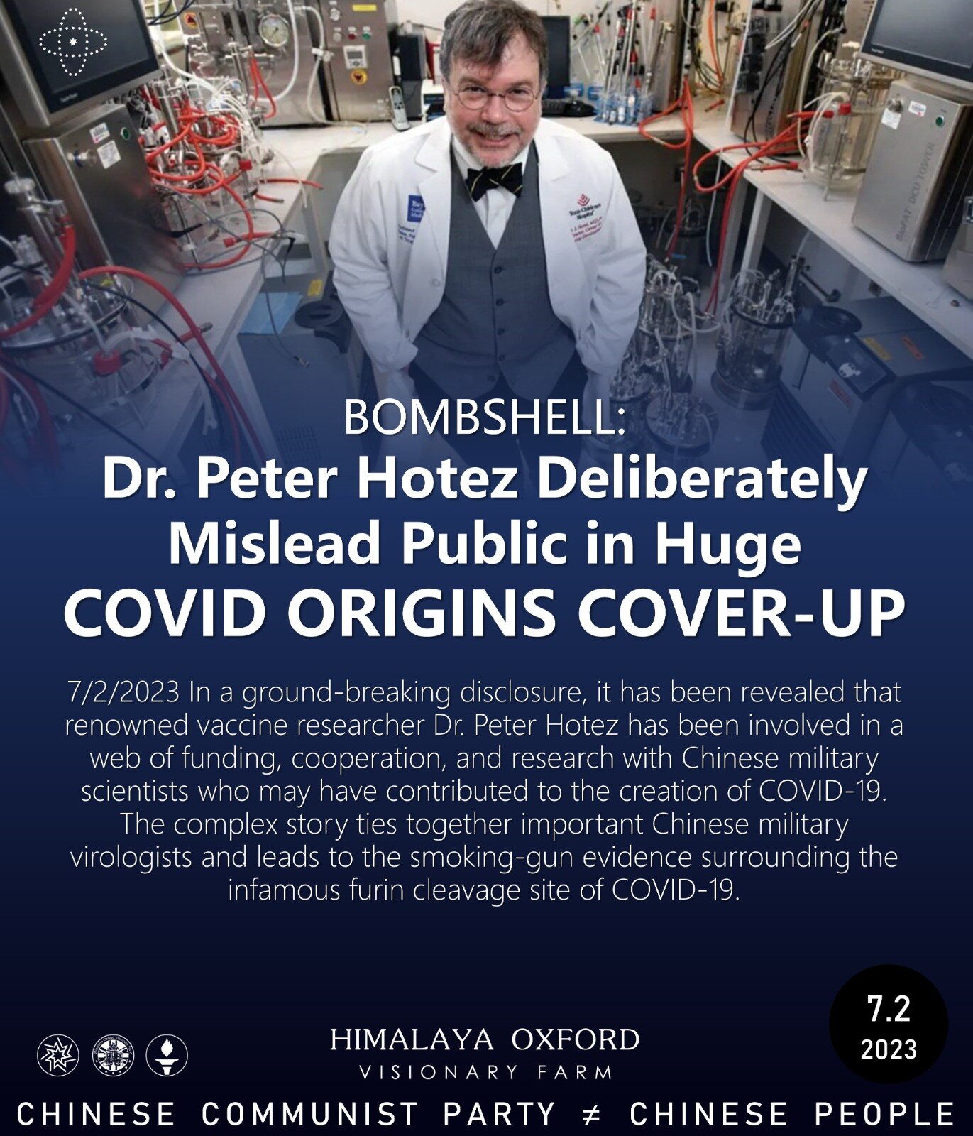 7/2/2023 In a ground-breaking disclosure, it has been revealed that renowned vaccine researcher Dr. Peter Hotez has been involved in a web of funding, cooperation, and research with Chinese military scientists who may have contributed to the creation of COVID-19. The complex story ties together important Chinese military virologists and leads to the smoking-gun evidence surrounding the infamous furin cleavage site of COVID-19.