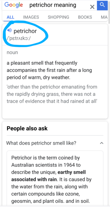 Learnt a new word today - "petrichor" - it's the smell when it rains after a long spell of dry weather. Never realized there was a word for it! See screenshot.