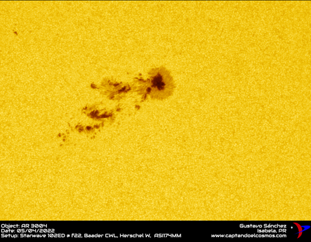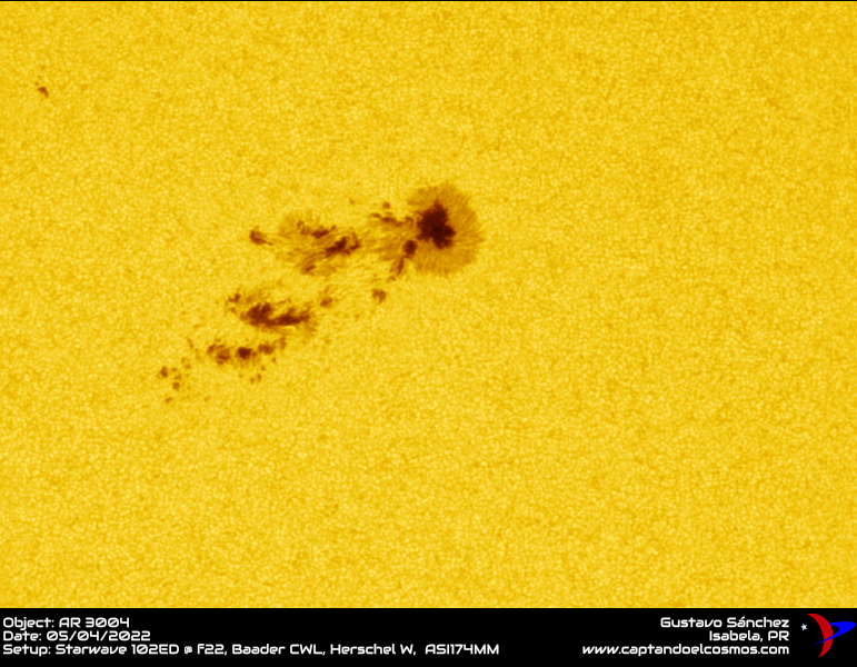 Good morning! #Weather has improved at last, and the #sun is shining! Well, through the clouds, but at least is not raining 😅 . I was able to get the #telescope outside, and image one the several active regions currently transiting the #solar #photosphere. This one, AR 3004, is the larger of the set, and it's quite a sight! Remember, even if they don't look "large" , given the sun's gigantic size, these sunspots are many times bigger than Earth!