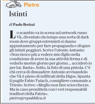 Social russo Vk. "Non riesco più a vedere mio figlio con l'attività ferma. Basta, ucciderò io per lui" (foto di una pistola). Interviene il consigliere comunale di Trieste Fabio Tuiach: "In caso prenditela con i veri responsabili traditori della patria".