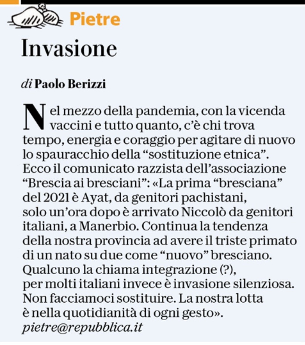 Il delirio razzista dei camerati di "Brescia ai bresciani", ovvero l'ossessione fascioleghista per la sostituzione etnica.