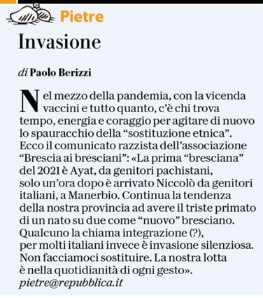 "La prima bresciana del #2021 è Ayat, da genitori pachistani. Continua l'invasione silenziosa. Non facciamoci sostituire".