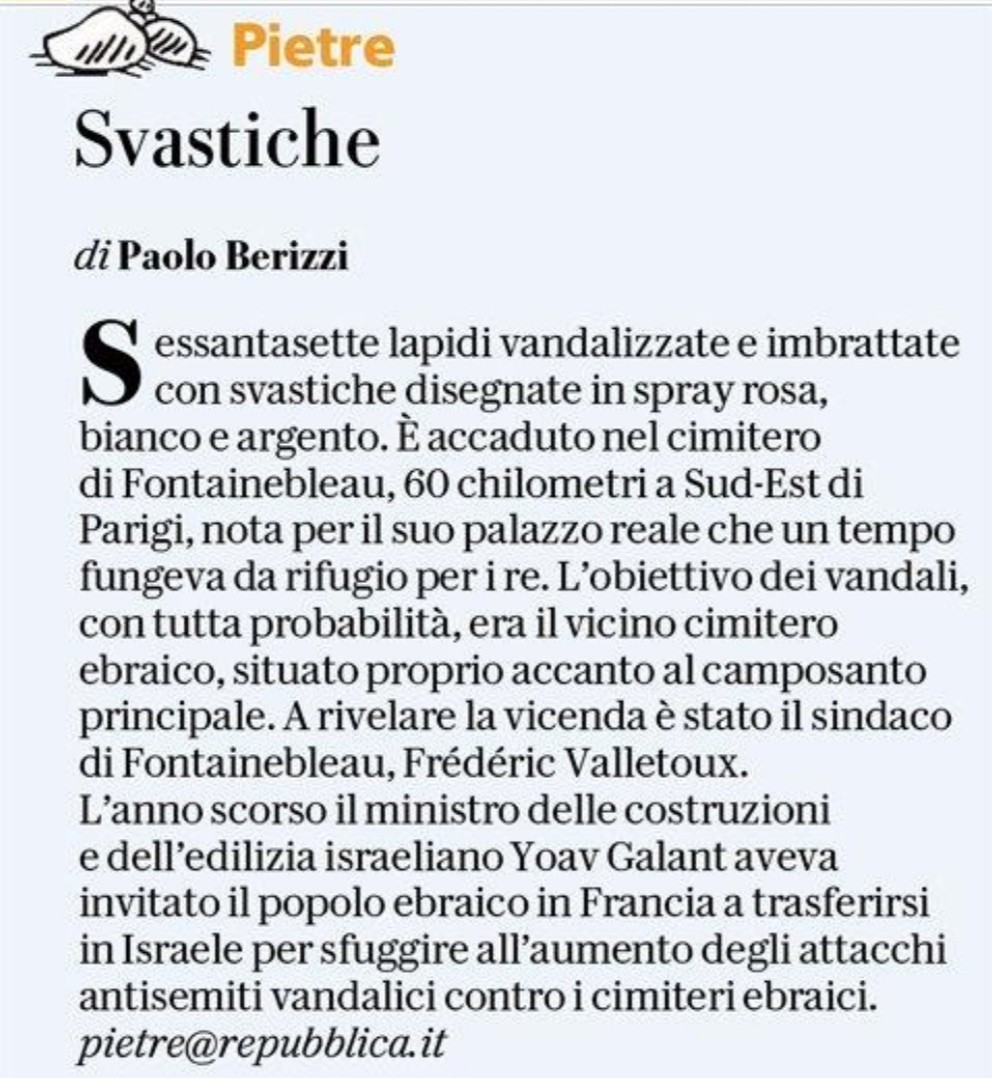 Sessantasette lapidi vandalizzate. La svastica come sfregio alla memoria. È accaduto in un cimitero a 60 km da #Parigi. Episodi simili sono all'ordine del giorno in mezza #Europa, ma nessuno ne parla. Come se i graffi del Male fossero ormai normalità.