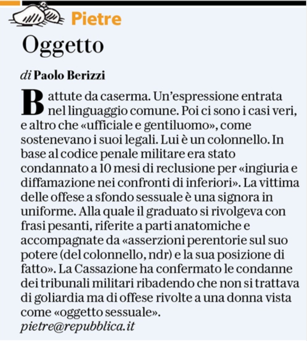 Le battute da caserma non sono goliardia. Il colonnello prende di mira la collega in divisa facendosi forte del suo potere; la tratta come un oggetto tempestandola di offese a sfondo sessuale. Risultato: condannato anche in Cassazione. Signorsì.