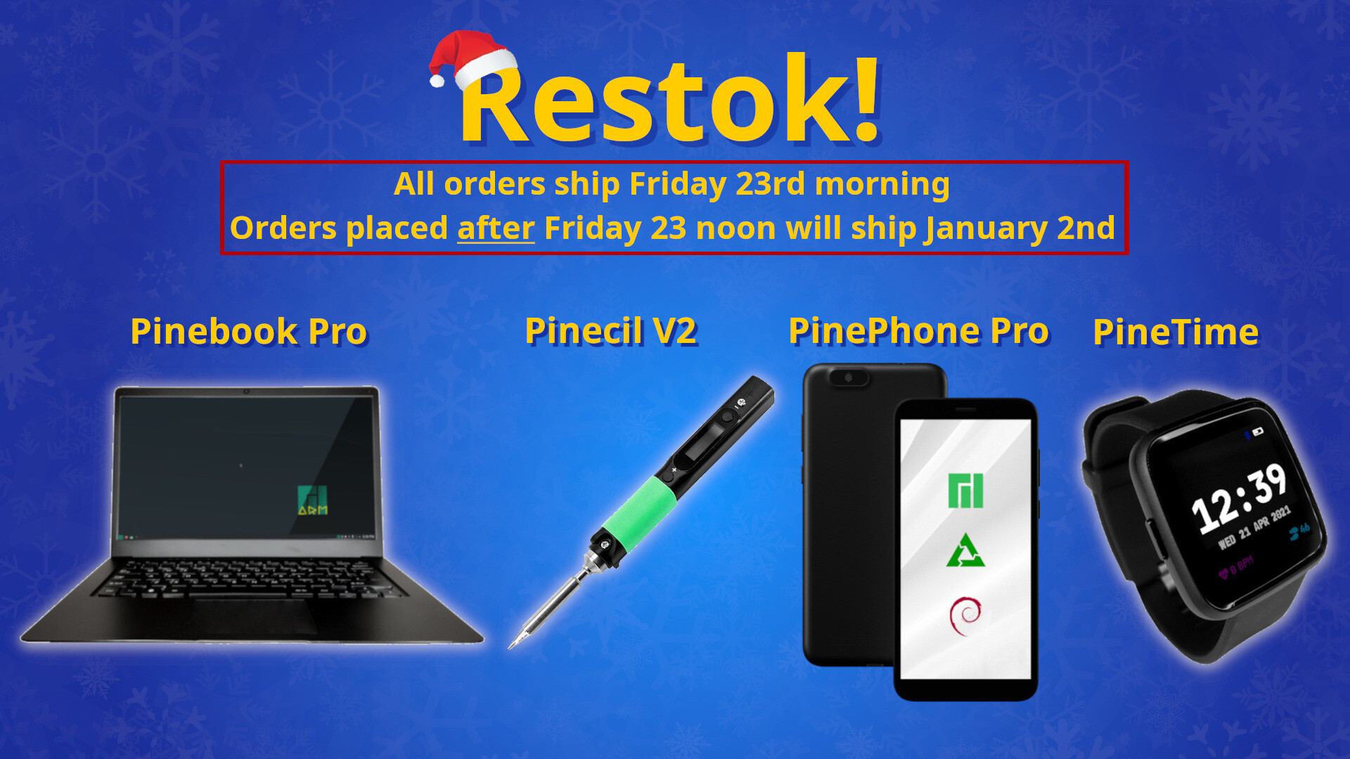 Restock will include: #PinePhone Pro, #PineBuds Pro, #PineTime and #Pinecil V2 and accessories (e.g. #PinePower and PinePhone Keyboard case)