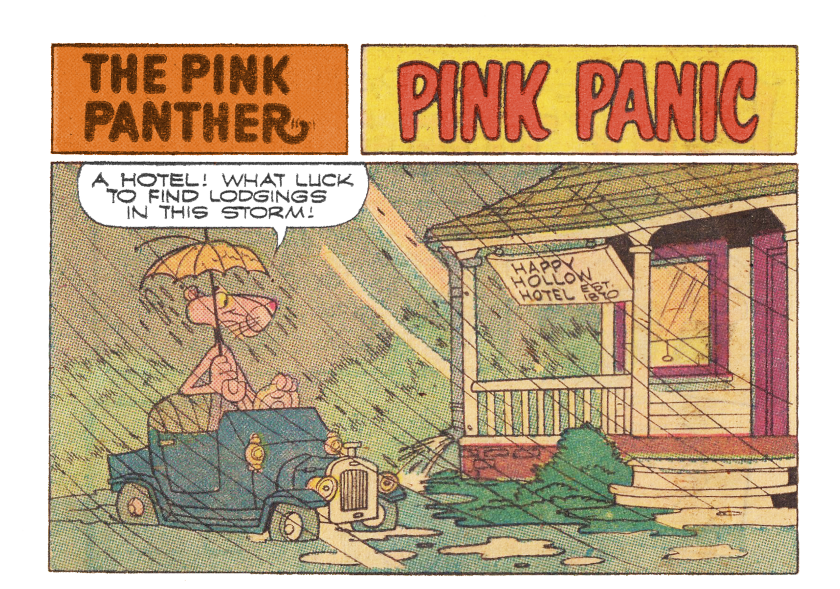 There's 3 different Pink Panther comic stories named PINK PANIC in the Western Publishing run of the comic. IN PP#2 crooks mistake Pinky for a ghost. The story in PP#15 is a take on Gulliver. In PP#45 Pinky is fooled by a crook into robbing a bank. In the 1967 PINK PANIC short Pinky is haunted by ghosts.