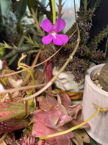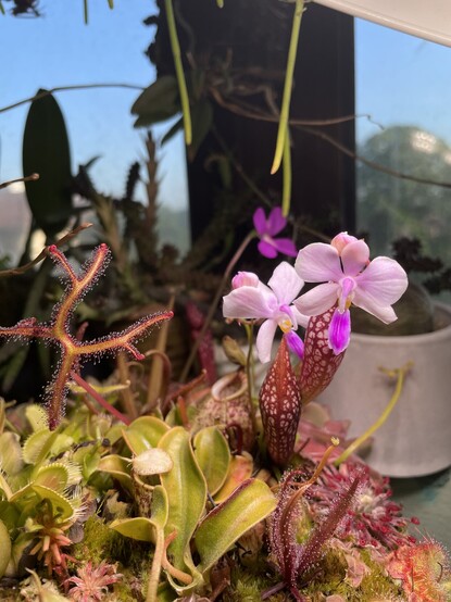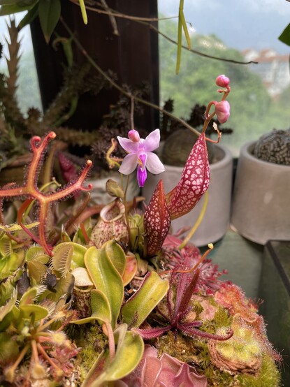 Also, you might have noticed this hot pink flower behind the orchid blooms - it’s the flower of a carnivorous butterwort, probably Pinguicula “Weser” (P. ehlersiae X moranensis), an easy-to-grow and ridiculously easy to propagate hybrid. #CarnivorousPlants #flower #florespondence #plantstodon #houseplants