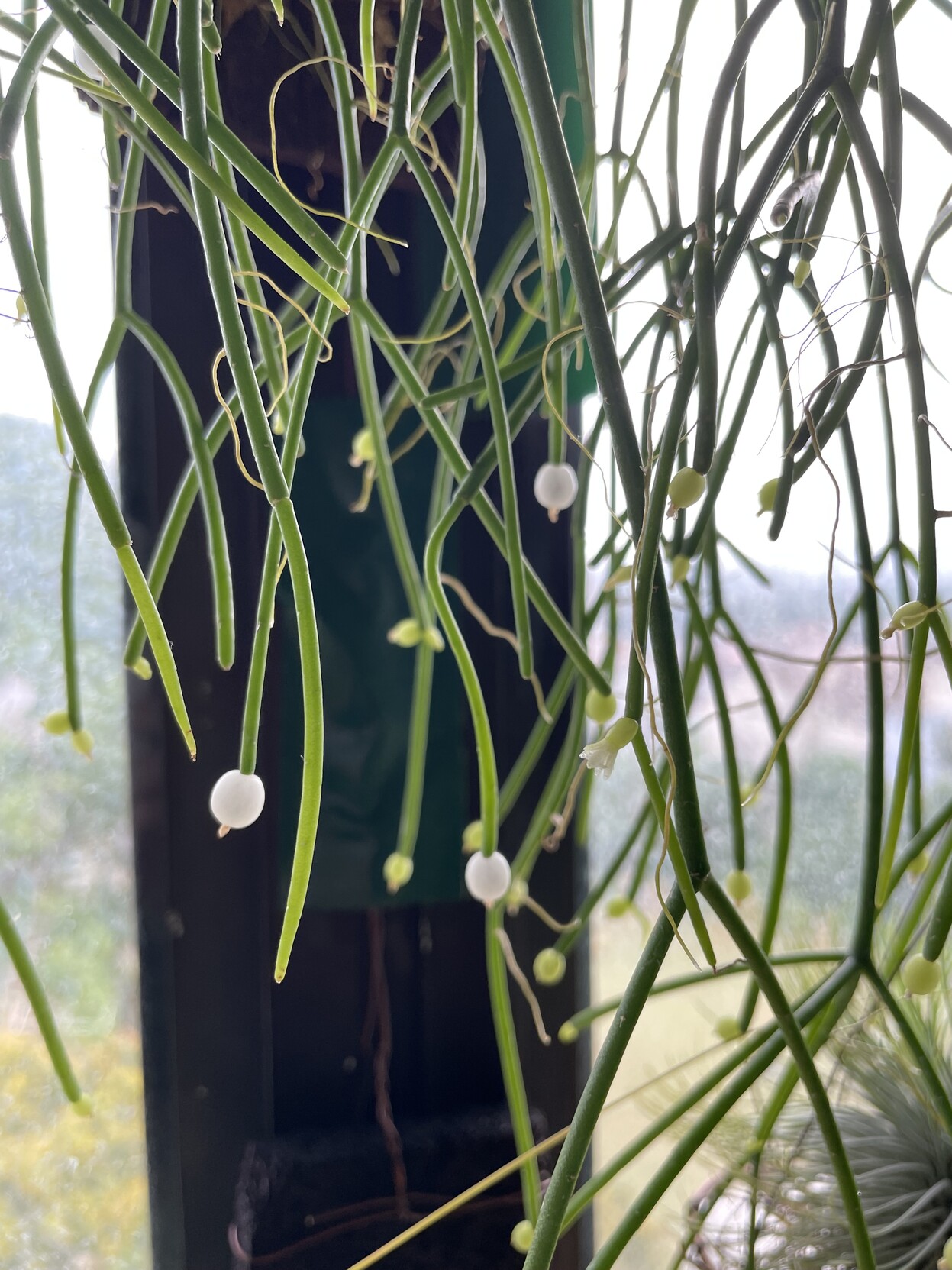 The fruits of Rhipsalis baccifera are pretty cute. Apparently they are edible, too! These are jungle cacti that grow on trees, so I’ve mine mounted on a slab.