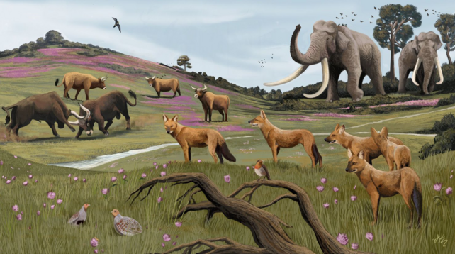 350000 years ago, just beyond the western edge of the icy #Schwarzwald, #spring has come to the #mammoth steppe. A raven flies over a group of steppe mammoths enjoying a cold bath in the Oos river, while a #Megaloceros grazes on some choice plants growing on the riverbanks. With the harsh winter in retreat for a few months, a flock of greylag geese migrates north, a buzzard hunts, and a small pack of wolves watch a herd of steppe #bison and some roe deer.