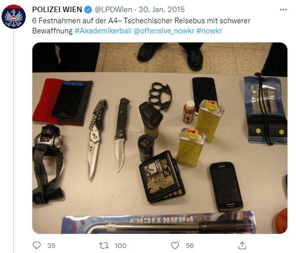ja lol, ey: #PolizeiWien prahlt bei Twittre mit beschlagnahmten Waffen aus einem Bus mit Antifas. Bei Akteneinsicht stellte sich heraus, dass die schweren Waffen ausschließlich bei 2 verdeckten Ermittlern gefunden wurden. xD