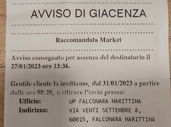Stesso giono arriva a Centro Operativo Postale di Milano. Dopo un giorno, la notte del 29 arriva all'Hub Nord di Milano.