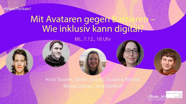 Mit Avataren gegen Barrieren – wie #inklusiv kann digital? Seid am kommenden Mittwoch, den 7.12. ab 18 Uhr live dabei und diskutiert mit Susanne Nikeleit, Jens Mühlhoff, Mireya Salinas, Anna Teuwen und Steven Solbrig: https://us02web.zoom.us/j/85844030191