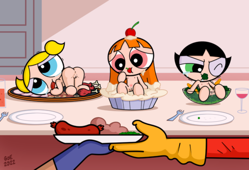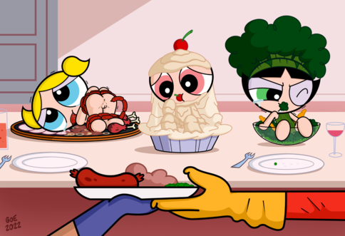 This is an entry for #PuffFest2022, commissioned by TheVNCritic. We made a PPG auction series sooner for the event. Mr Smith got the girls and are using them as culinary decorations. That is what they get for ruining Mrs. Smith dinner! Based on the episodes: "Supper Villian" and Just Desserts. :bloss: 🥧 :bubbles: 🍗 :buttercup_shades: 🥦