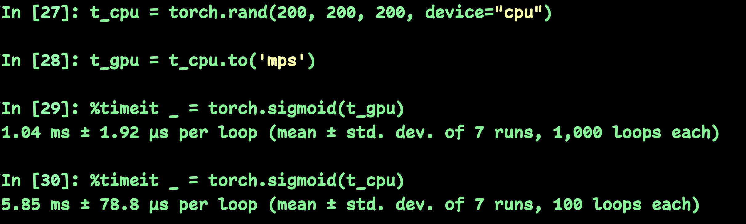 Hello world of "is this gpu on"; construct a an 8 million element tensor and compute sigmoid on it. Roughly 5x faster on the GPU than CPU. #pytorch