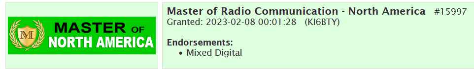 New #QRZ award today! Just made "Master of North America" on mixed and digital.