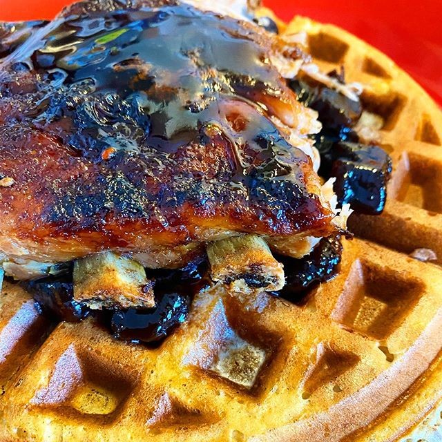 Ribs and waffles, with a local savory pear chutney. #QuarantineCooking