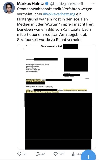 Der angeblich für die Meinungsfreiheit „kämpfende“ #Quatschjurist #Haintz verfasst eine #Quatschjura-Anzeige, um eine missliebige Meinung zu unterdrücken. Und wundert sich dann, warum richtige Juristen mit richtigem Jura antworten und seinen #Bockmist in Ablage P ablegen.
