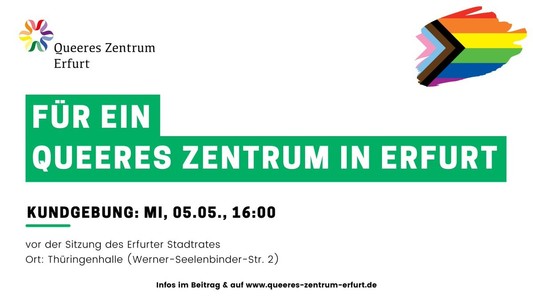 #Erfurt braucht ein #QueeresZentrum! Damit das auch im Stadtrat auch alle verstehen, gibt's heute (05.05.) 16:00 Uhr eine Kundgebung vor der Thüringen Halle, in der sich zur gleichen Zeit der Stadtrat trifft. 📢Unterstützt heute die Kundgebung und @QueerZentrumEF generell. 🏳️🌈