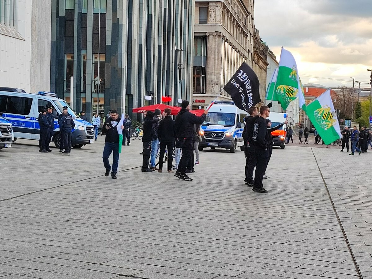 Auch Mützen in Reichsfarben und "Freie Sachsen"-Fahnen sind am Start