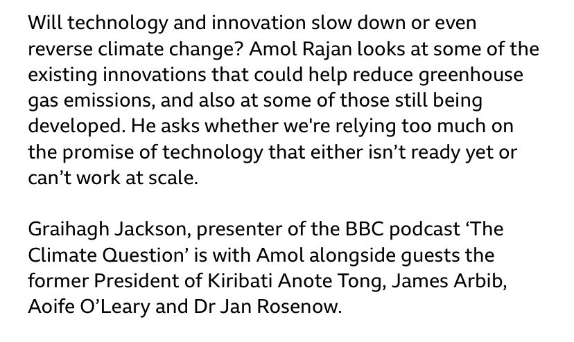 Didn’t realise yesterday but in fact #Rethink Climate is a week long #Radio4 series, hosted by Amol Rajan. Listened to another excellent episode just now, on Green Technology. Really great #R4 is starting the year in this way - hearing Graighagh Jackson say “economics needs to change” etc. whole series on #BBCSounds, link below