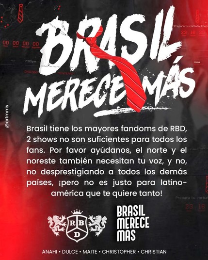 Tô super feliz com o retorno do RBD, mas sinceramente, a distribuição de shows tá PÉSSIMA. O Brasil tem o maior fandom da banda e só farão 2 show aqui, enquanto os EUA vai ter 21 shows, até em cidades com 20mil habitantes. América Latina foi esquecida. #SoyRebelde #RBDISBACK