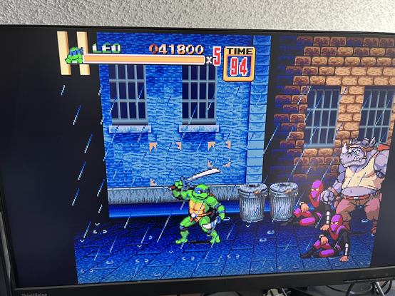 I am absolutely up for this! Someone smashed the latest TMNT game's assets into the Streets of Rage 2 ROM from the Sega Genesis (Bare Knuckle 2 on Megadrive). Here it is running on a MiSTer FPGA system.