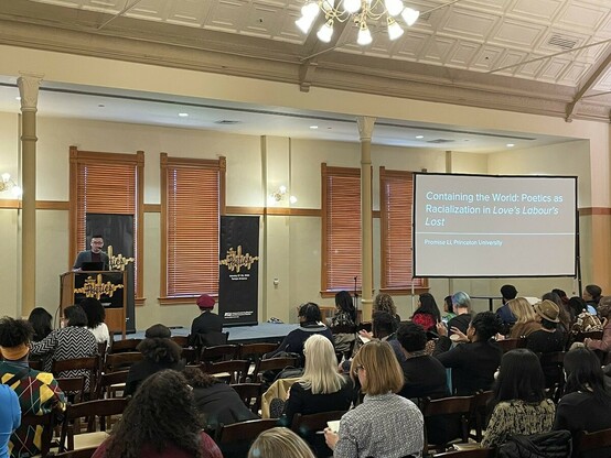 Our final talk for #RaceB4Race Poetics is underway with @promiseli0@twitter.com’s talk “Containing the World: Poetics as Racialization in Love’s Labour’s Lost”!