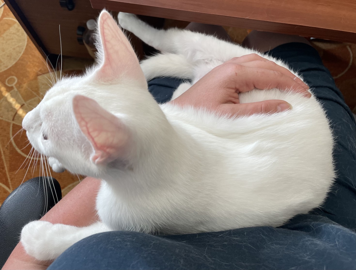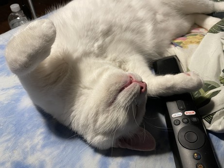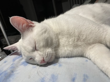 #Raf se válí na koupelnové předložce a soustředeně si vykusuje drápky.
