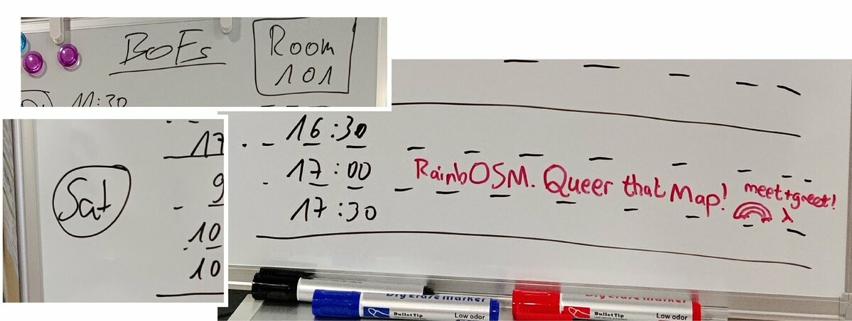 I've scheduled a #RainbOSM (queers/LGBTQ+ in #OpenStreetMap ) social meet & greet for Sat (tomorrow) 17:00-17:30 (Birds of a Feather (BoF) session: Room 101)