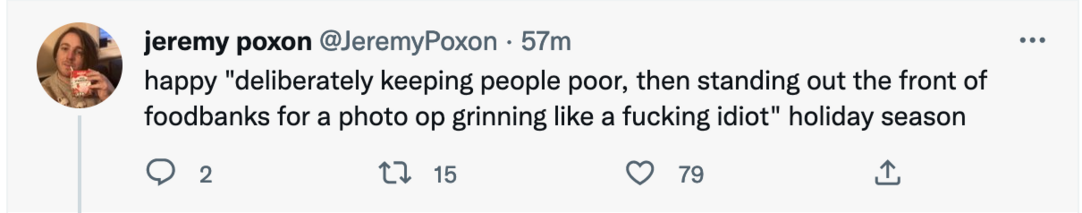 happy “deliberately keeping people poor, then standing out the front of foodbanks for a photo op grinning like a fucking idiot" holiday season