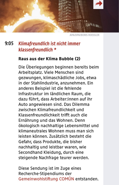 Achtung! Heute um 9:05 Uhr ist es soweit, auf @oe1 startet die 4teilige Serie „Raus aus der Klima Bubble“ von @johanna_hier zum Thema #Klima & Klasse!