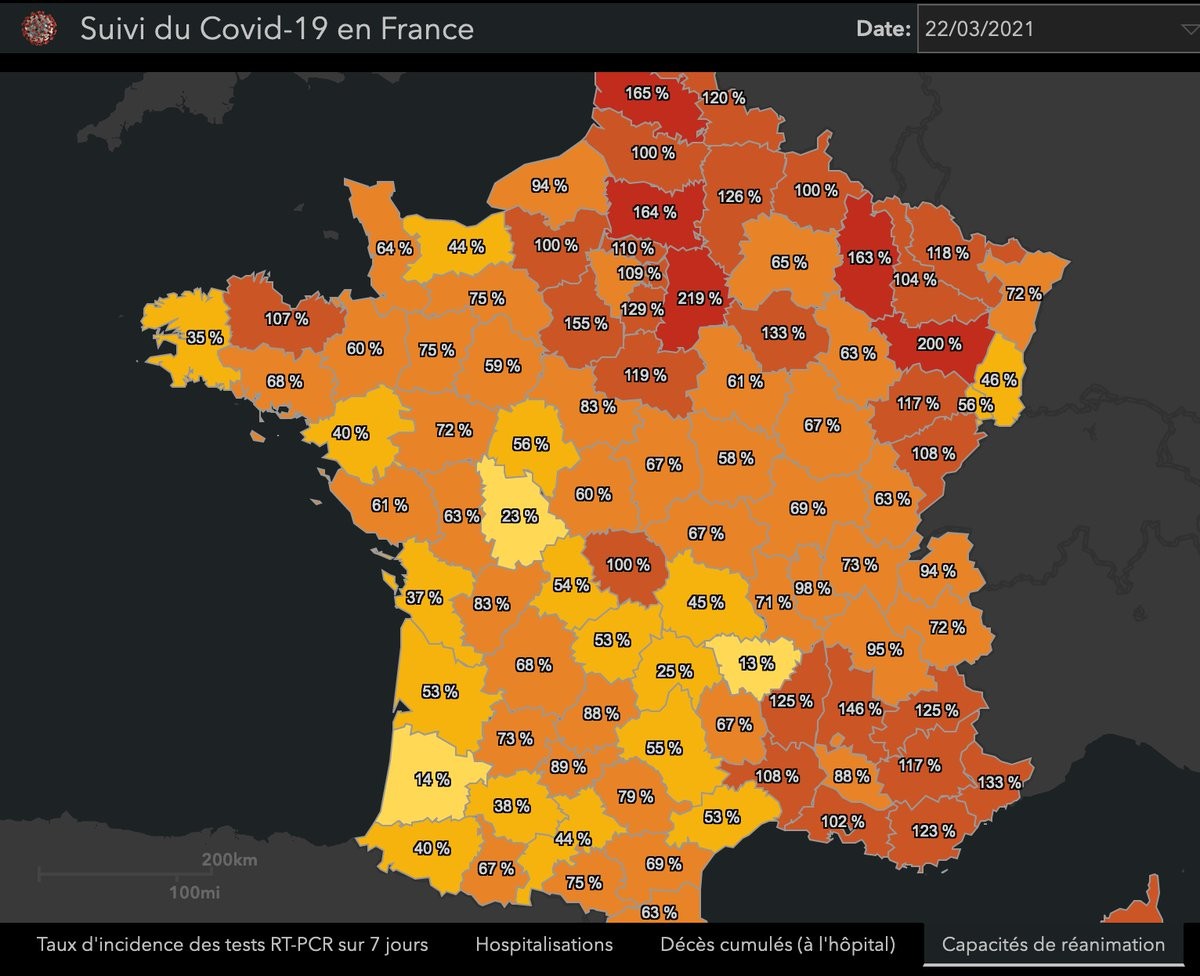 So so. Anbei mal die aktuellen Zahlen aus Frankreich. Inzidenzen über 500, 600 & Intensivbettenauslastung über 100% an etlichen Orten. Da gehts hin wenn man aus wahltaktischen Gründen simplistisch nur "Freiheit" ruft trotz offenkundig zunehmender Infektionen. #Regierungsfähigkeit https://twitter.com/c_lindner/status/1373978132504584193