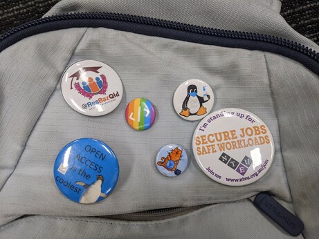 The QUT Library stall at #ResBazQLD has a button maker, so I've added a ResBaz badge to my rather grubby work backpack 😸