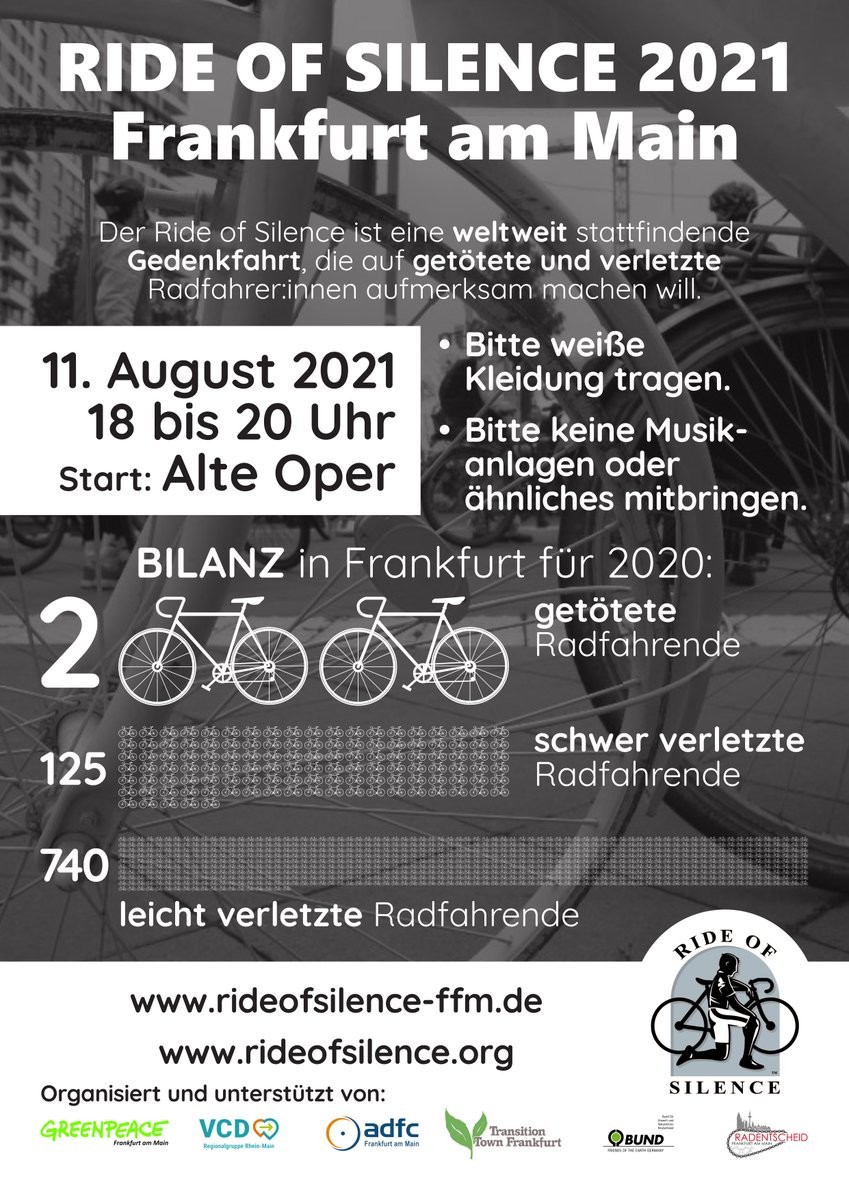 Morgen möchten wir mit euch beim #RideOfSilence den im letzten Jahr 2 getöteten, 125 schwer verletzten und 740 leicht verletzten Radfahrenden in #Frankfurt gedenken.